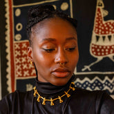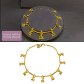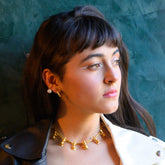 Stunning Pre-Columbian Panama necklace reproduction featuring staring frog pendants. Crafted with meticulous detail, this 19" lightweight 24k gold-plated bronze piece adds a playful touch to any outfit, making it the perfect accessory for historical jewelry lovers and fashion enthusiasts alike.