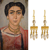 These beautiful dangle earrings are inspired by the Crotalia earrings that were very common in ancient Roman times as documented in the Fayum mummy portraits. Earrings are 24k gold plated accented with four white-ish cultured pearls. Handcrafted.
