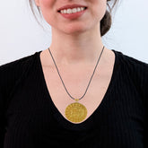 pre-Columbian style 24k Gold Plated pendant resembling the Mayan Calendar. The pendant is handcrafted and 24k Gold Plated. The leather cord is accented with two golden beads.