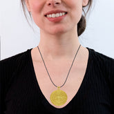 24k Gold Plated Aztec Solar Calendar or Piedra del Sol pendant. The original is exhibited at the National Museum of Anthropology, Mexico City. The leather cord is accented with two golden beads.