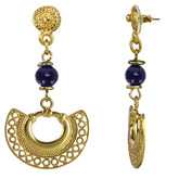 Beautiful preColumbian style earrings resembling an ornament from the Tairona Culture. Earrings are 24K Gold Plated and accented with amethysts. Handcrafted.