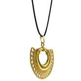 This pendant is inspired by a nose ring from the Tairona Culture in pre-Columbian times. The piece is decorated with circles and carved braids. The leather cord is accented with two golden beads.