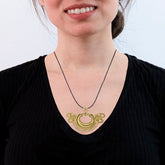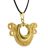 PreColumbian style 24K Gold Plated pendant resembling a beautiful butterfly with two animal heads ornament from the Tairona Culture. The leather cord necklace is accented with two round beads.