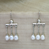 These beautiful dangle earrings are inspired by the Crotalia earrings that were very common in ancient Roman times as documented in the Fayum mummy portraits. Earrings are elaborated out of .950 silver and accented with four white-ish cultured pearls. Handcrafted.